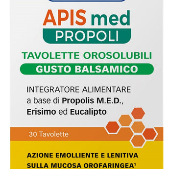 Integratore alimentare in compresse da sciogliere in bocca contenente propoli ed estratti vegetali ad effetto balsamico. La propoli impiegata è ottenuta tramite un processo produttivo brevettato di multi estrazione dinamica, che consente di eliminare la cera e le altre impurità e di ottimizzare la standardizzazione dell’estratto nel complesso dei 6 polifenoli principali. L’erisimo e l’eucalipto favoriscono un’azione emolliente e lenitiva sulla mucosa orofaringea.
