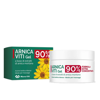 Arnica Viti Gel 90% è un preparato cosmetico a base di un’elevata percentuale di estratti di arnica. Impiega due tipologie di estratti per arrivare ad una formula potenziata con il 90% totale di arnica.