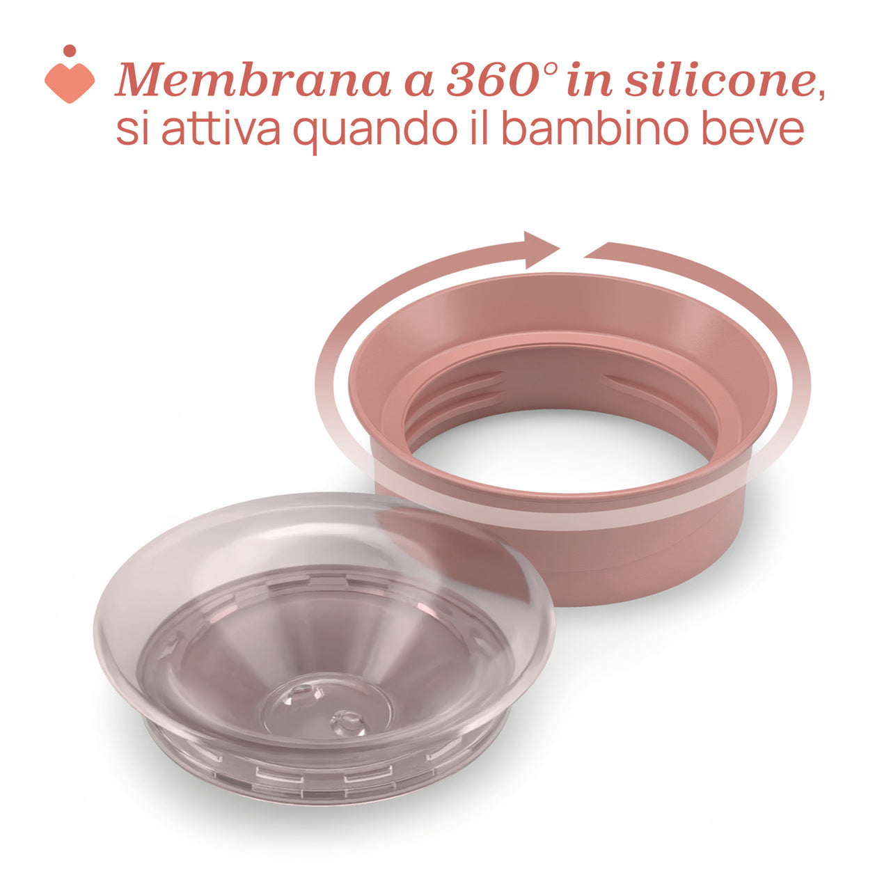 - MEMBRANA IN SILICONE 360°: si attiva con le labbra, rilasciando il liquido quando il labbro del bambino preme contro il bordo. La membrana è trasparente, così il bambino può vedere il liquido avvicinarsi.