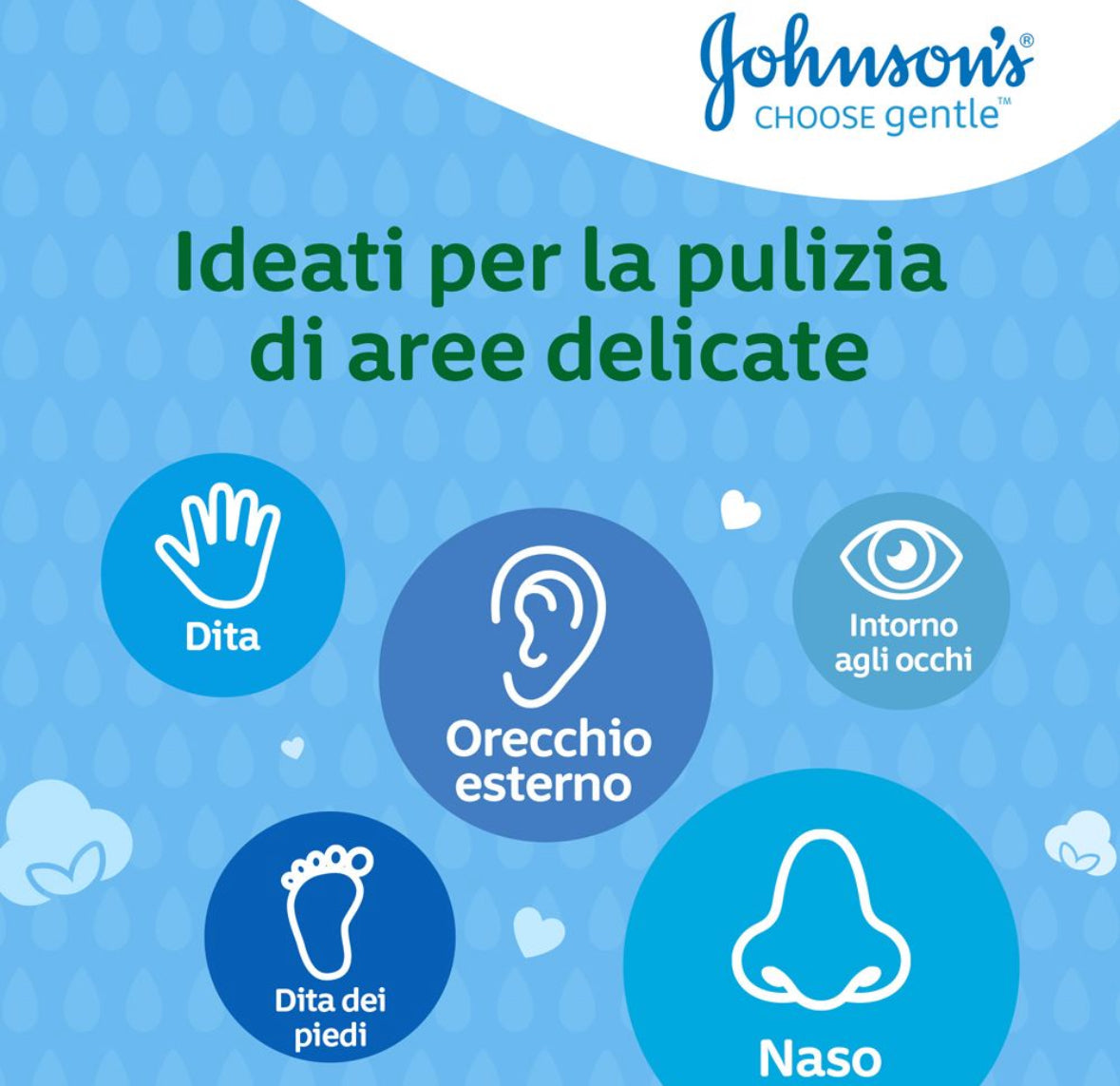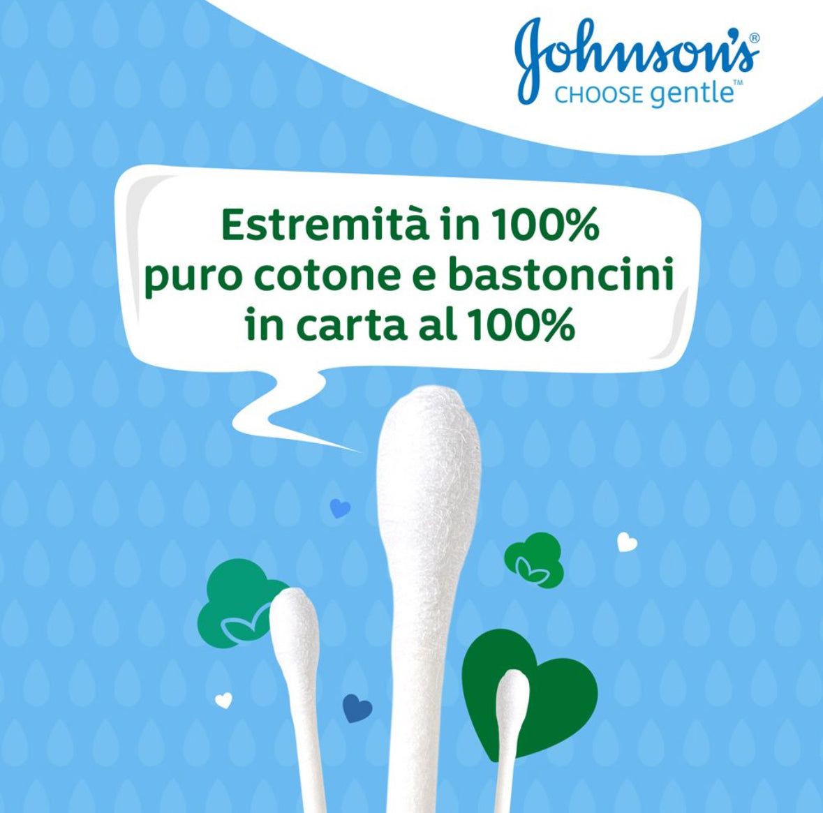 Molto morbidi per essere utilizzati sulla pelle delicata, si assorbono naturalmente grazie all'estremità in puro cotone al 100%. Per pulire l'area tra le dita delle mani e dei piedi e le altre pieghe della pelle. Ideale per il bambino. Ideale per voi. Ideali per applicare o rimuovere il trucco e per un'infinità di altri usi. La pelle dei neonati è la più delicata. Ecco perché in oltre 125 anni abbiamo perfezionato i nostri prodotti, ora ancora più delicati per tutti. La forma unica del JOHNSON'S® Baby Cotton Fioc rende la cura del bambino e la pulizia della delicata zona intorno alle orecchie più facile e sicura grazie alla punta accuratamente progettata. Ideale per bambini e adulti. Scegliamo solo ingredienti di alta qualità adatti ai bambini che soddisfano i nostri standard Best for Baby. COME SI USA: Usare il Baby Cotton Fioc per pulire delicatamente le piccole pieghe e gli avvallamenti intorno alle orecchie del bambino, facendo molta attenzione perché la zona è molto sensibile. Usare il Baby Cotton Fioc dopo il bagnetto per asciugare delicatamente la superficie esterna dell'orecchio o tutte le volte che si desidera rimuovere delicatamente lo sporco visibile e il cerume. Questa confezione è realizzata con materiali riciclati ed è riciclabile. Eliminando la plastica dalle nostre confezioni risparmieremo l'equivalente di circa 30 milioni di sacchetti di plastica* *dato basato sul volume delle vendite del 2019 in Europa, Medio Oriente e Africa e su un sacchetto di plastica da 10 g. AVVERTENZA: Non inserire mai il bastoncino di cotone nel canale auricolare o all'interno del naso. Tenere fuori dalla portata dei bambini. Solo per uso esterno. L'uso improprio può causare lesioni.-Questa confezione è realizzata con materiali riciclati ed è riciclabile. Eliminando la plastica dalle nostre confezioni risparmieremo l’equivalente di circa 30 milioni di sacchetti di plastica* *dato basato sul volume delle vendite del 2019 in Europa, -Medio Oriente e Africa e su un sacchetto di plastica da 10 g.