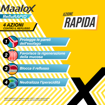 Prodotto ad azione meccanica a base di Sodio Alginato, bicarbonato di sodio, sodio carbonato e calcio carbonato, formulato per svolgere 3 azioni sinergiche: bloccare rapidamente il reflusso acido, ridurre il bruciore e proteggere la mucosa dell’esofago.