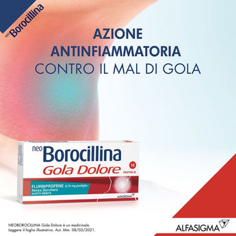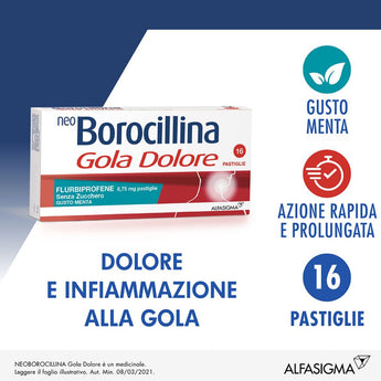 Neo Borocillina Gola Dolore contiene flurbiprofene. Il flurbiprofene appartiene ad un gruppo di medicinali chiamati Farmaci Antinfiammatori Non Steroidei (FANS). Questi medicinali alleviano i sintomi modificando la risposta del corpo al dolore e alla febbre.