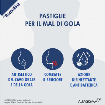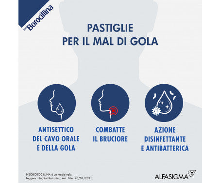 Neo Borocillina pastiglie contiene i principi attivi 2,4 diclorobenzil alcool e sodio benzoato ed appartiene ad una categoria di farmaci detti antisettici (antibatterici) del cavo orofaringeo (bocca e gola), utilizzati per la cura dei sintomi delle malattie infiammatorie della bocca e della gola.