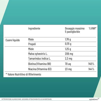 Zucchero, sciroppo di glucosio, ripieno a base di propoli e miele 15% [miele 64%, zucchero invertito, propoli estratto madre 4%; addensante: gomma arabica; zucchero], miele 8%, malva (Malva sylvestris L.) estratto secco da foglie; stabilizzante: glicerolo; aroma naturale limone, tamarindo (Tamarindus indica L.) estratto secco da frutto, biotina (Vitamina B8), niacina (Vitamina B3).