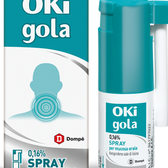 OKi gola 0,16% spray per mucosa orale contiene come principio attivo ketoprofene sale di lisina, una sostanza che appartiene ad un gruppo di medicinali chiamati “Farmaci Antinfiammatori Non Steroidei” (FANS), ed è un medicinale stomatologico usato per il trattamento locale del cavo orale.