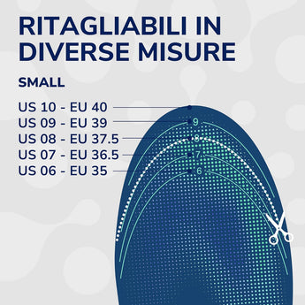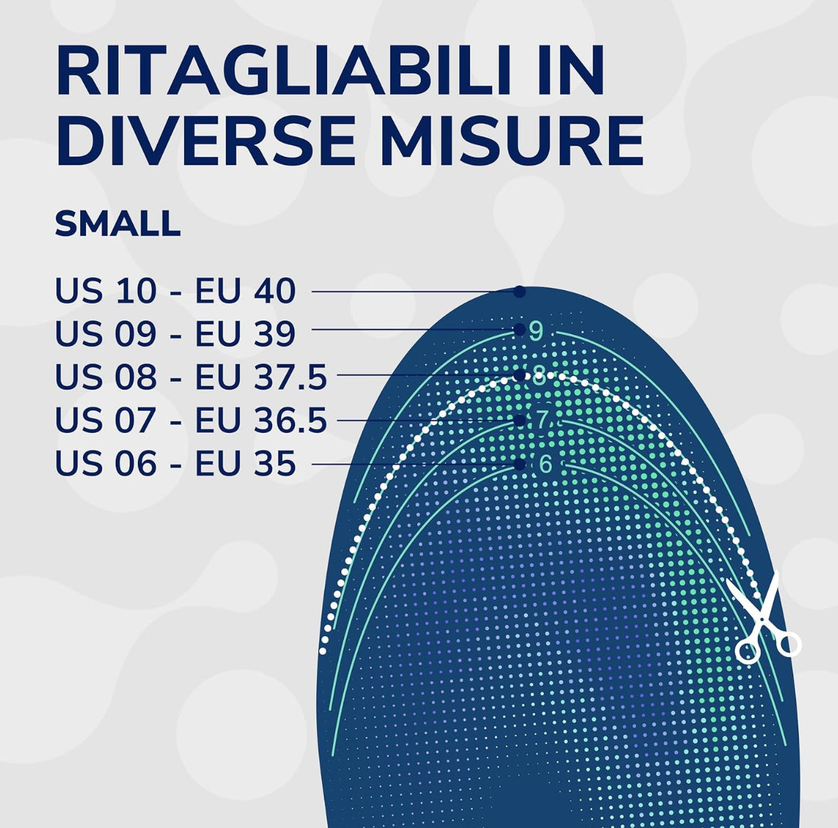 Queste solette sono ritagliabili per adattarsi alla forma del piede. Leggere le istruzioni d’uso all’interno della confezione. Sostituire le solette ogni 6 mesi o in caso di usura. Interrompere l’uso in caso di reazione avversa o qualunque fastidio. Non usare su pelle lesa o danneggiata. Prodotto adatto alle persone affette da diabete.
