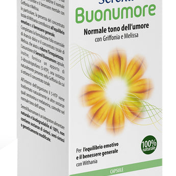 Integratore alimentare naturale e biodegradabile al 100%, utile per favorire il normale tono dell'umore e il benessere mentale con griffonia e melissa. In particolare, la presenza del concentrato totale di withania contribuisce all'equilibrio emotivo e al benessere generale. Completano la formulazione l'olio essenziale di arancio dolce e il concentrato totale di melissa, che aiuta a ridurre l'irrequietezza. L'assunzione di Serenil Buonumore capsule, inoltre, fornisce un apporto di 5-idrossitriptofano (5-HTP), una sostanza naturalmente presente nella griffonia da cui si ottiene il concentrato totale. All'interno dell'organismo il 5-HTP viene trasformato naturalmente in altre sostanze quali serotonina e melatonina, coinvolte nel normale tono dell'umore. Serenil Buonumore non contiene sostanze di sintesi, semi-sintesi o geneticamente modificate.