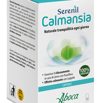 Integratore alimentare naturale e biodegradabile al 100%, utile in caso di agitazione, tensione e irritabilità collegati alle situazioni di ogni giorno (impegni di lavoro, studio, stress) o in periodi particolari, come la menopausa. In particolare, il concentrato totale di Passiflora aiuta a indurre il rilassamento e la presenza del concentrato totale di Luppolo contribuisce all'effetto calmante. Completano la formulazione il concentrato totale di Ziziphus e l'estratto di biancospino utile per la regolare pressione arteriosa. Serenil Calmansia non contiene sostanze di sintesi, semi-sintesi o geneticamente modificate.