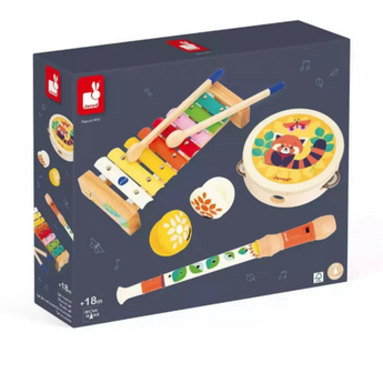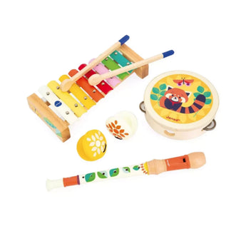 Per i neonati, i giocattoli sonori sono un ottimo modo per stimolare l'udito e scoprire diversi suoni. Per i bambini dai 3 anni in su, è divertente imitare gli adulti e indossare i panni di una star con il proprio strumento preferito! Questo set di strumenti musicali comprende: 1 xilofono in legno e metallo con 8 note e 2 bacchette, 1 tamburello magnificamente illustrato, 1 flauto in legno colorato, 2 nacchere dai colori vivaci. 4 giocattoli ideali per la stimolazione musicale e la condivisione! Questo set di strumenti per bambini è ideale per proporre un'ampia gamma di sonorità o dare il via a un concerto di gruppo. Ciascuno strumento produce un suono differente e deve essere manipolato in modo particolare: questo set è il regalo di compleanno perfetto per i più curiosi o per gli apprendisti musicisti! Ideale per sviluppare la fantasia dei bambini, che potranno immaginarsi sul palcoscenico nel bel mezzo di uno spettacolo o dare ai loro peluche una lezione di teoria musicale. Quale sarà il loro giocattolo musicale preferito? E il tuo?